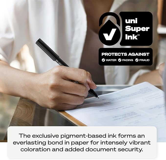 - UNI SUPER INK: Water- and fade-resistant ink helps you compose long-lasting, high-quality documents you can archive; Our pens offer protection against water, fading, and fraud for both personal writing and professional writing.