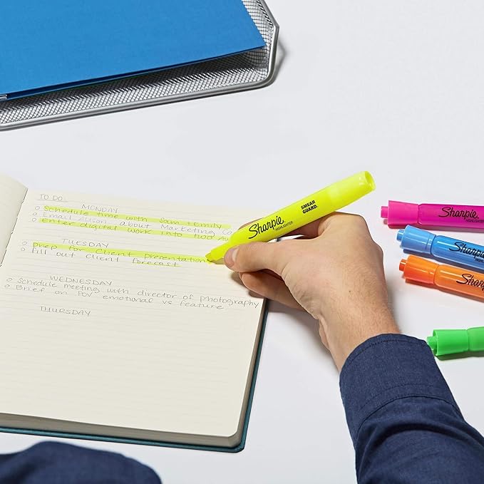 - Sharpie Tank Highlighters with wide barrel and large ink supply that delivers dependable highlighting