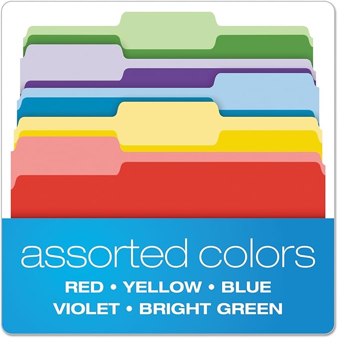 - 11 point, assorted color folders with lighter interior to prevent misfiles; perfect for letter size sheets and documents