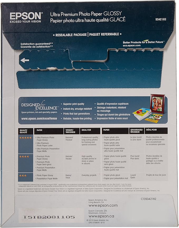 Epson Ultra Premium Photo Paper Glossy, Letter, 8.5 x 11, 25 Sheets (S042182), White