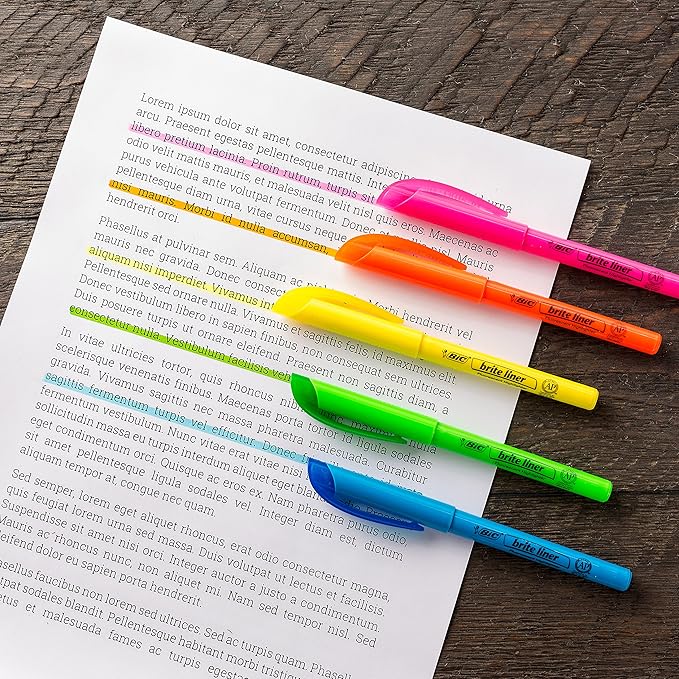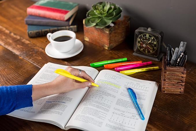 - Highlighter set with translucent ink that emphasizes what's important on the page without obscuring the highlighted text