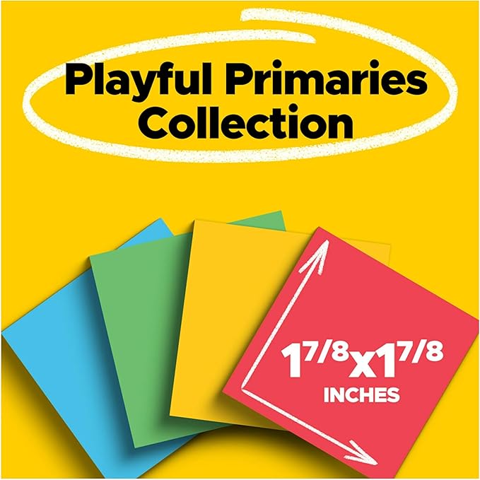 Post-it Super Sticky Notes, 8 Sticky Note Pads, 1.875 x 1.875 in., Back to School Supplies for Students, Ideal for Textbooks, Notebooks, and Vertical Surfaces, Playful Primaries Collection