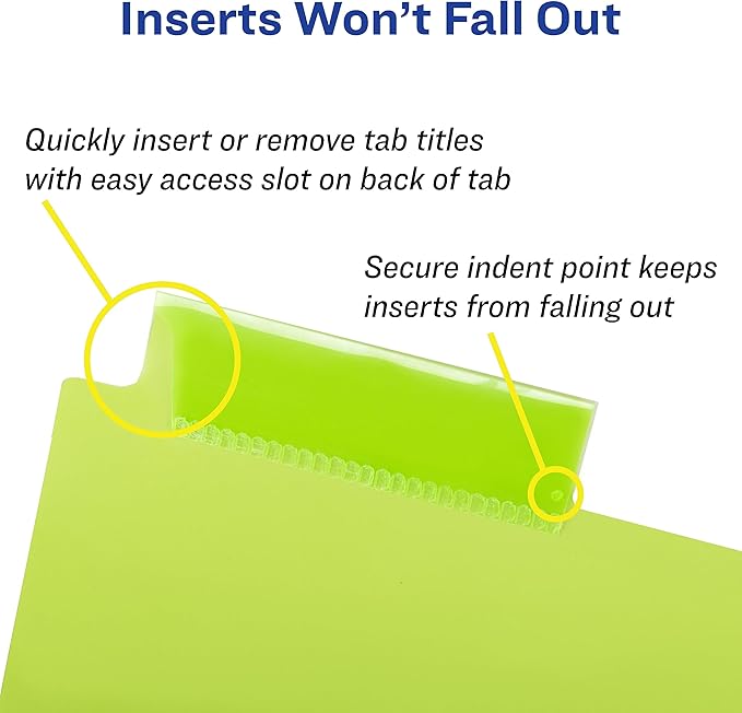 - Secure Inserts: Each tab on these page dividers incorporates a secure indent lock system and easy access slot to keep inserts firmly in place and simple to adjust