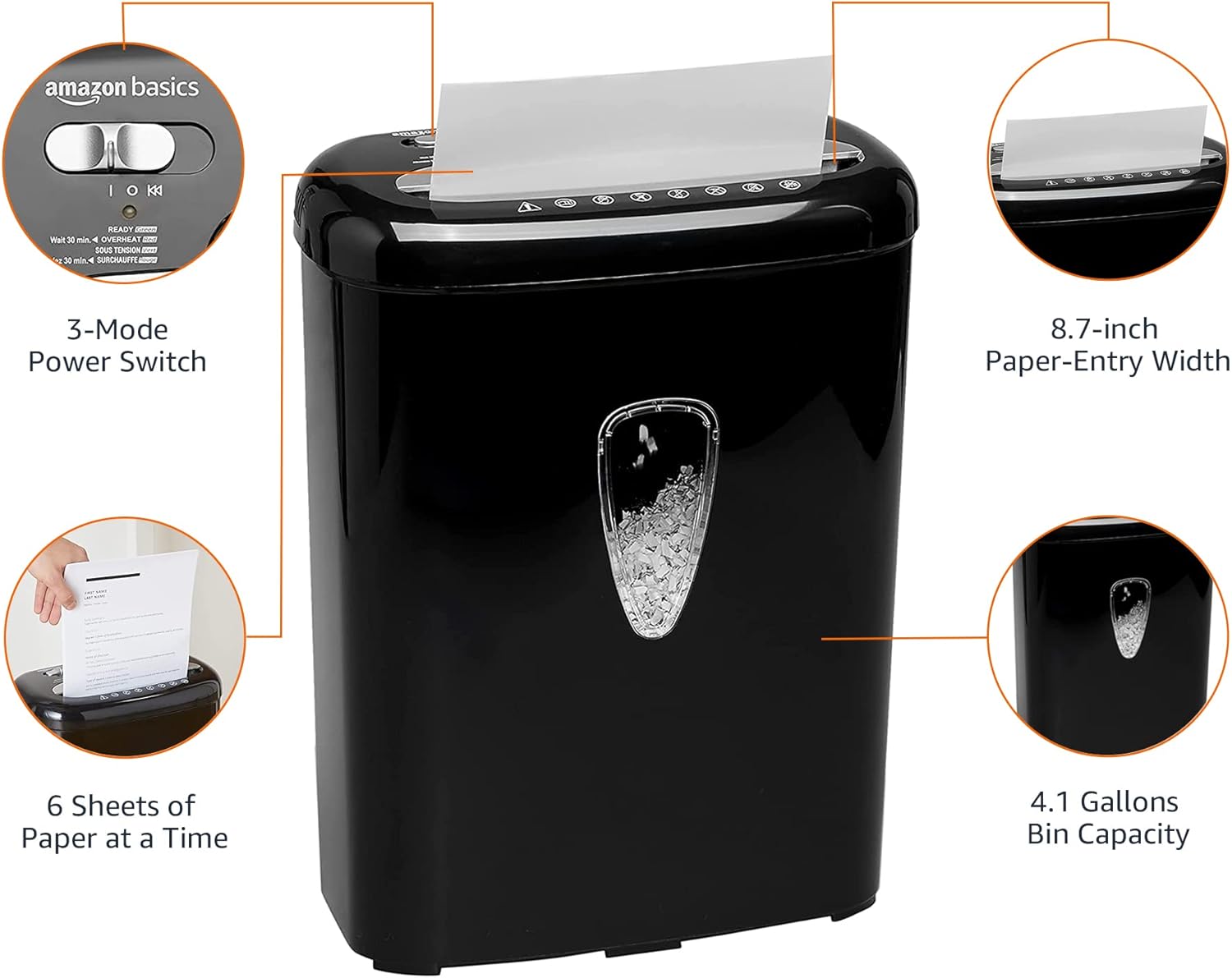 - 3-mode power switch (auto, off, reverse); auto start and overload protection to prevent serious paper jams; LED indicator (power on, overheat); 8.7-inch paper-entry width; lift handle for easy shredder-head lifts up; easy-to-empty 4.1-gallon bin