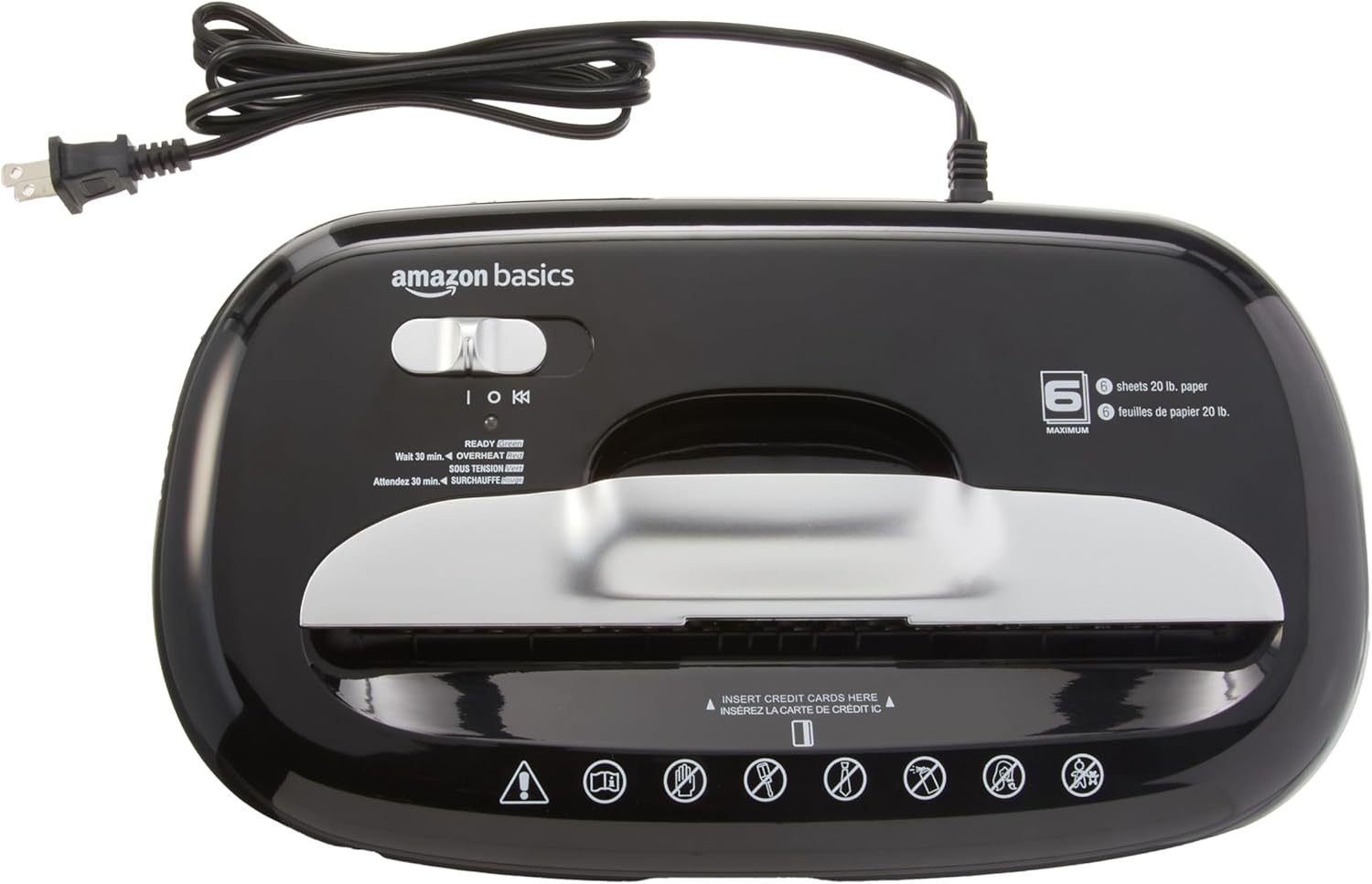 - Shreds up to 6 sheets of 20-pound bond paper at a time; also destroys credit cards (one at a time, through dedicated slot), staples or small paper clips