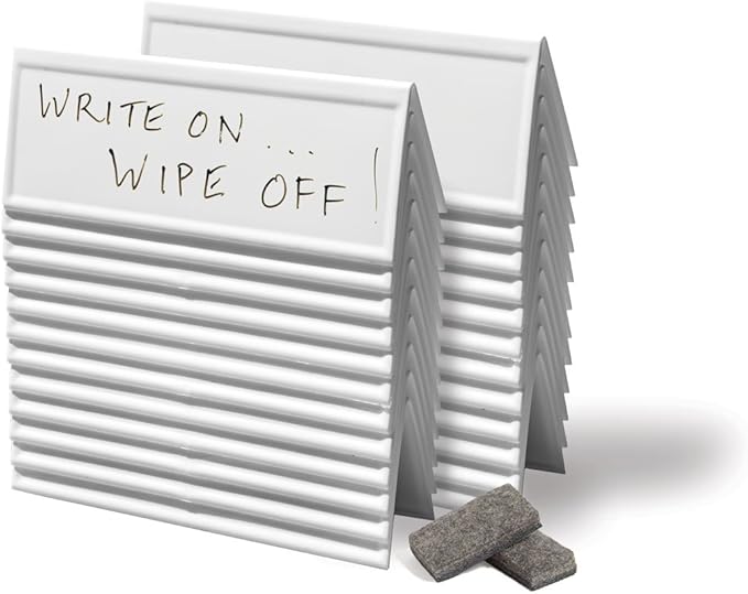 - PREMIUM TWO-SIDED WHITEBOARD TENTS: Enhance your meetings with these high-quality, 24 Reusable Name Tents, 12 Mini-erasers (2.5" x 1.25" x .65"), 12 black dry-erase markers, 1 see-through vinyl tote* to carry it all! (12" H x 12" W x 6" D). Crafted from durable materials, these tents offer a sleek, professional look, perfect for corporate trainings, conferences, or classrooms. Elevate your event's ambiance with these sophisticated and practical name visibility solutions.