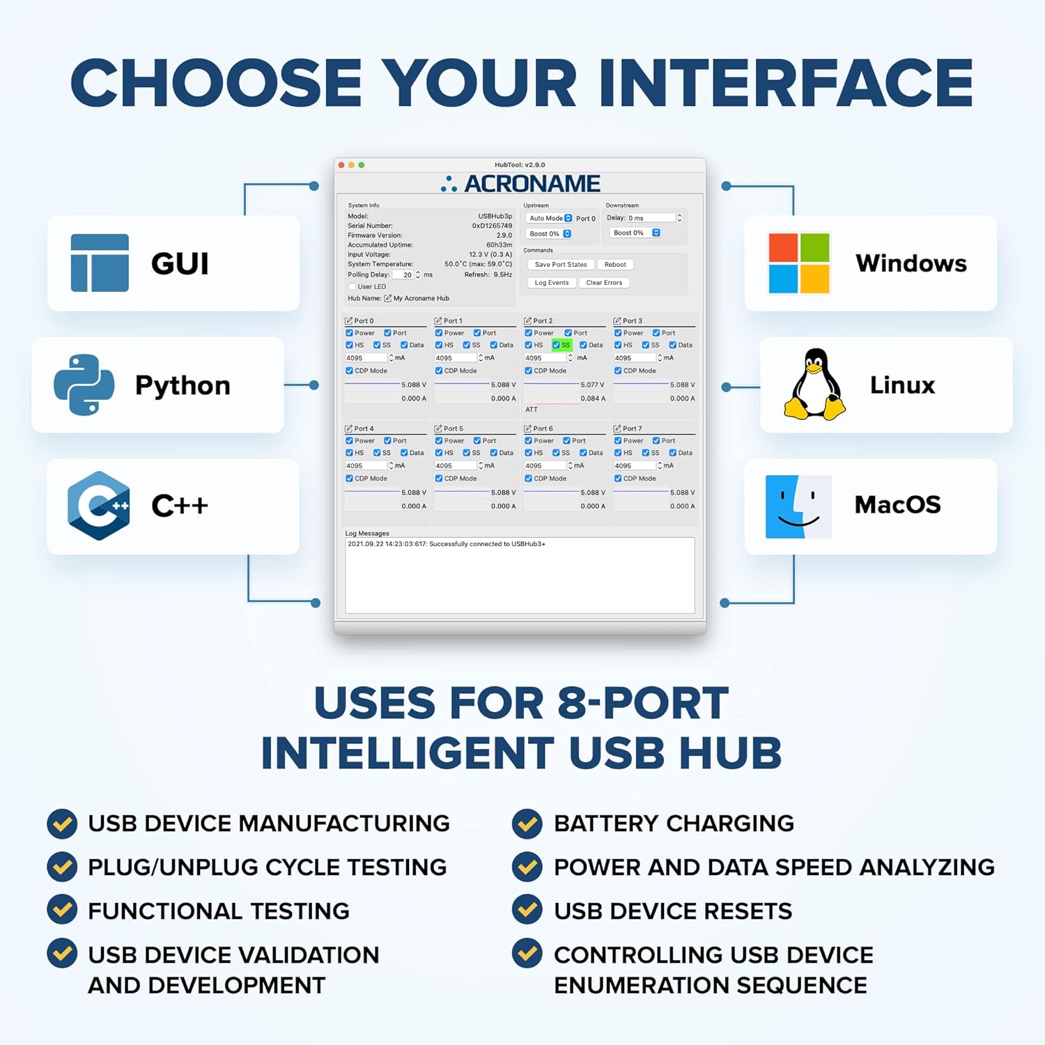 - [Managed Solution] - Programmable industrial grade USB hub, 9 downstream, 2 upstream ports individually control and measure port voltage, current and data transfer