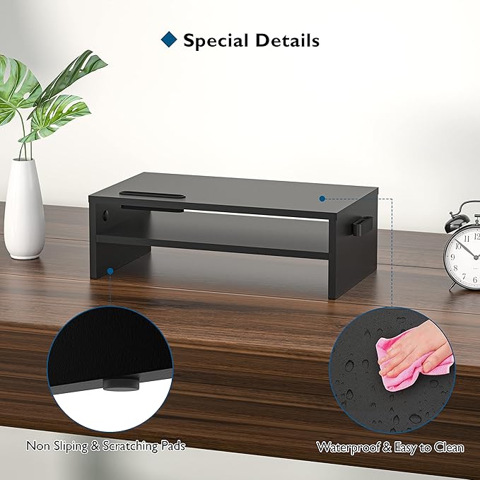 - 【MONITOR RISER STAND WITH STORAGE ORGANIZER】Our monitor stand rise comes with cable management slots that can make your cord stay organized. Cell phone holder will free your hands to make work easier. The monitor shelf provides enough area for storing laptops, keyboards, wireless mice, and daily necessities to keep your desktop tidy.