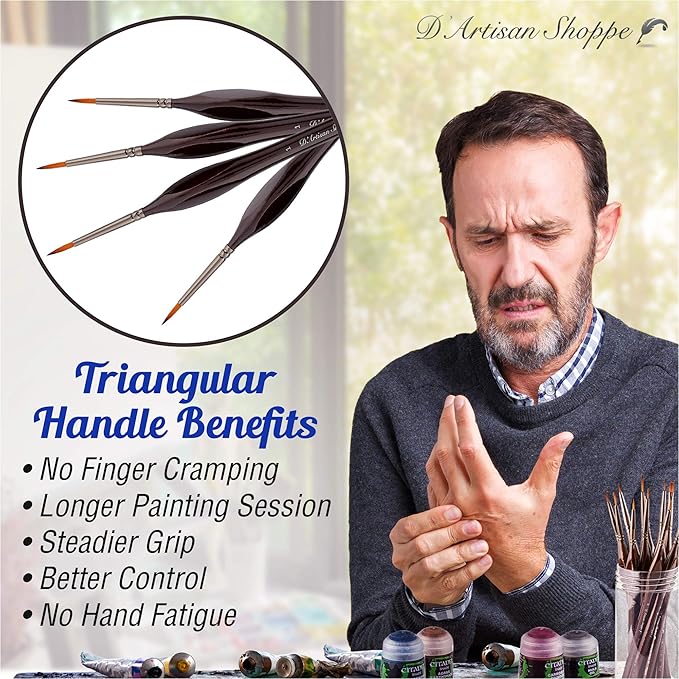 - Comfortable triangular handles gives you a good grip to keep your hand steady when using these model paint brush set. Offers great control and ideal for wargaming miniature painting such as Warhammer 40K, painting mini's like games workshop, DnD miniatures. No more hand cramping compared to thin paint brush variants.