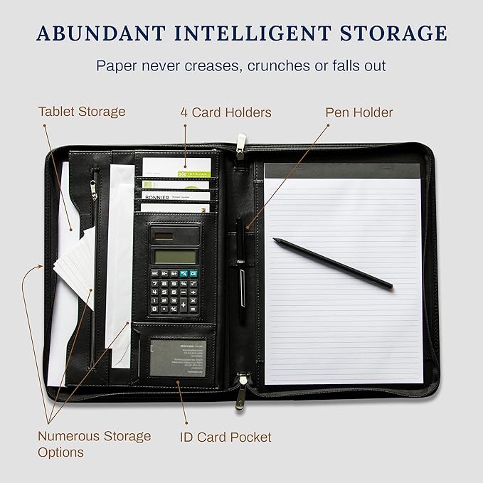 - Still superior, and now upgraded for life’s biggest advancements: Originally crafted to suit the advanced professional, we recently added smart changes to this customized vegan leather portfolio for those returning to pursue their MBA, or interviewing for that next wrung up the ladder; features include solar calculator, full PU leather interior, dual start zipper, and abundant storage so paper never crunches or falls out