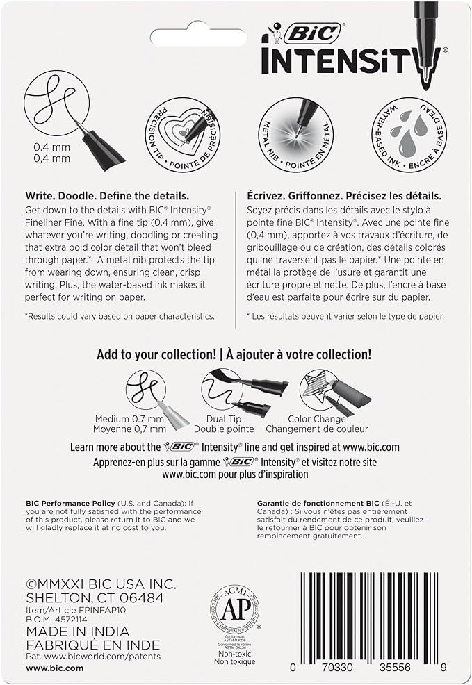 BIC Intensity Fineliner Marker Pens, Fine Point (0.4 mm), Assorted Colors (Colors May Vary), 10-Count
