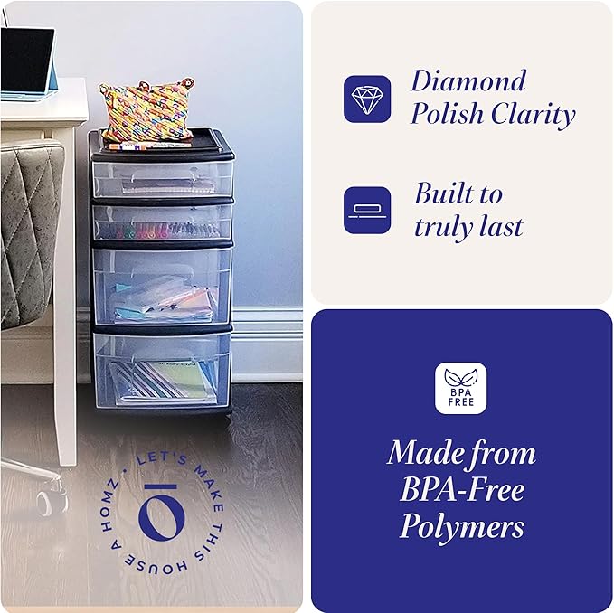 - Plastic Storage Cart: Perfect the art of hiding your hoard with the HOMZ storage drawer set. This plastic cart is made to fit anywhere you need organizing power, whether at home or work.