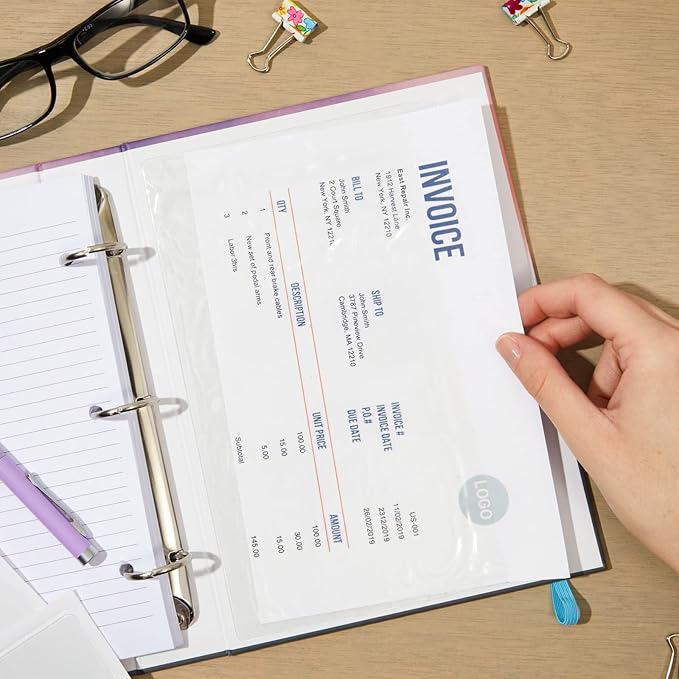 - Plastic Adhesive Pockets: Use these self-adhesive pockets to neatly organize your various-sized business cards, invoices, or photos in a planner, presentation book, or picture binder