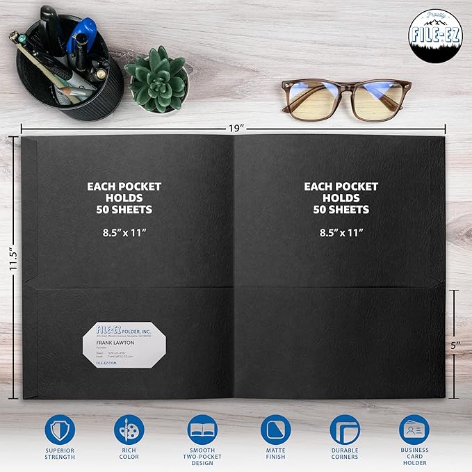 • BUY WITH CONFIDENCE: 4th generation family owned business, FILE-EZ Folders, Inc. has been providing folders for over 65 years. You can count on their superior design for function, quality and reliability.