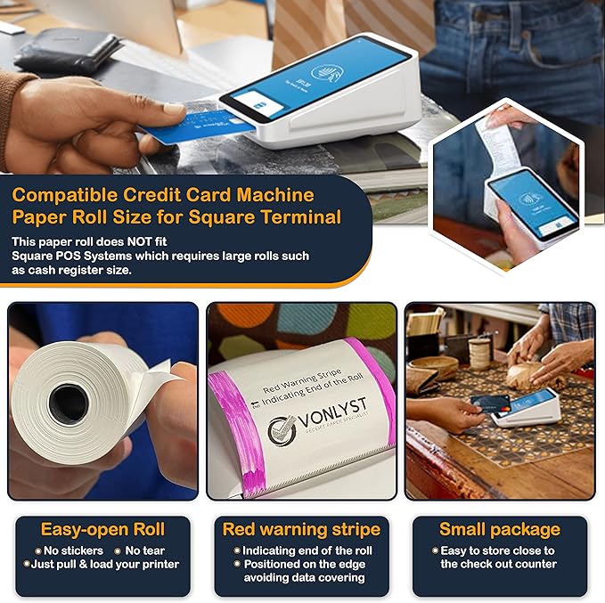 - PAPER ROLL SIZE ingeniously created to provide maximum performance for Square Terminal credit card machine payment printer Vonlyst thermal receipt paper rolls are precisely manufactured in size of 2 1/4” x 55’ (width x length)