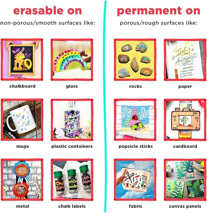 - Comes Off Easy - The chalkboard ink pen will work on almost any surface! Will erase off non-porous surfaces; such as blackboard (wet erase), glass & mirrors (dry erase) and Permanent on porous surfaces