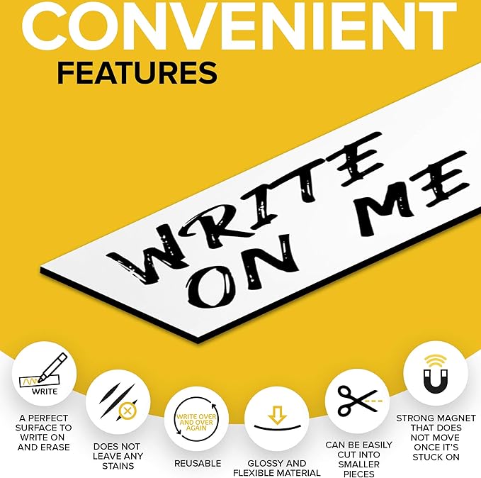 - ⭐EASY TO CUT, INSTALL and REUSABLE magnetic stickers. Write on them with a dry erase marker, wipe them off and use them again. Dry erase magnetic tape use for labeling storage shelves, labeling cabinets, whiteboards, magnet labels on the refrigerator, toolboxes, teaching aids, message boards, stockroom shelf labels, menu boards, planning boards, file cabinets, refrigerators, retail signs, and every other magnetic surface.