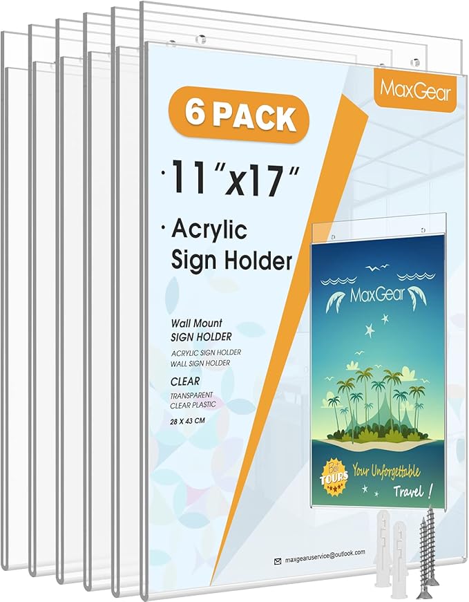 MaxGear Acrylic Sign Holder 11 x 17 inches Wall Mount Sign Holder with Screws Clear Plastic Wall Acrylic Frame for Office, Home, Store, Restaurant, Letter Size: 11 x 17 in, Acrylic, Vertical, 6 Pack