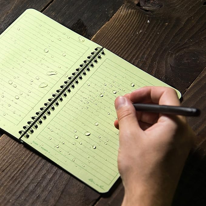 - WEATHERPROOF PAPER: 64 pages / 32 sheets per side spiral notepad. All-weather paper won’t turn to mush when wet and will repel water, sweat, grease, mud, and even survive the accidental laundry mishap. Make sure your pocket notebook stays RIGHT in the Rain.