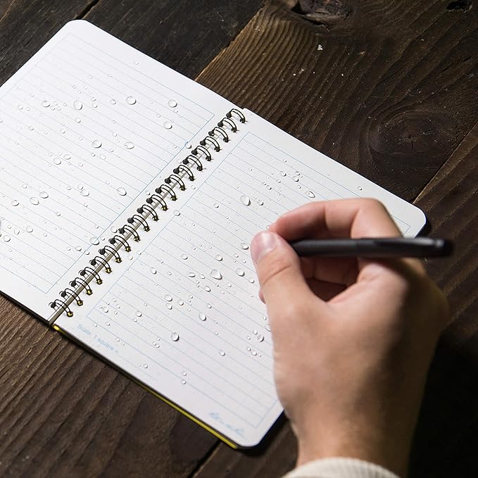 - WEATHERPROOF PAPER: 64 pages / 32 sheets per side spiral notepad. All-weather paper won’t turn to mush when wet and will repel water, sweat, grease, mud, and even survive the accidental laundry mishap. Make sure your pocket notebook stays RIGHT in the Rain.