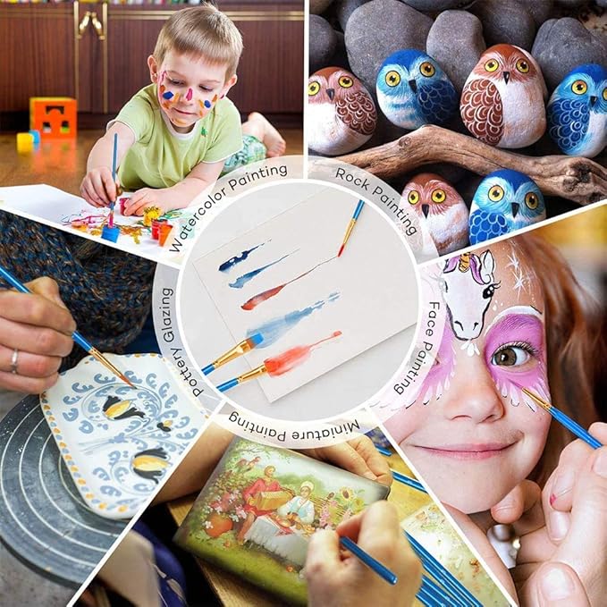 - Widely Used: This fine tipped paintbrush set work in all mediums, including acrylic, watercolor, enamel, oil, cel-vinyl and gouache paints. Assortment of art brushes give you the right brush for painting jobs, perfect for wildlife, botanical, portraiture, doll, war hammer 40K, D & D miniatures and paint by numbers, as well as body, nail and face painting. The brush bristles soft enough for children's delicate skin, and durable enough to paint on rock, model, ceramic, leather, gesso, etc.