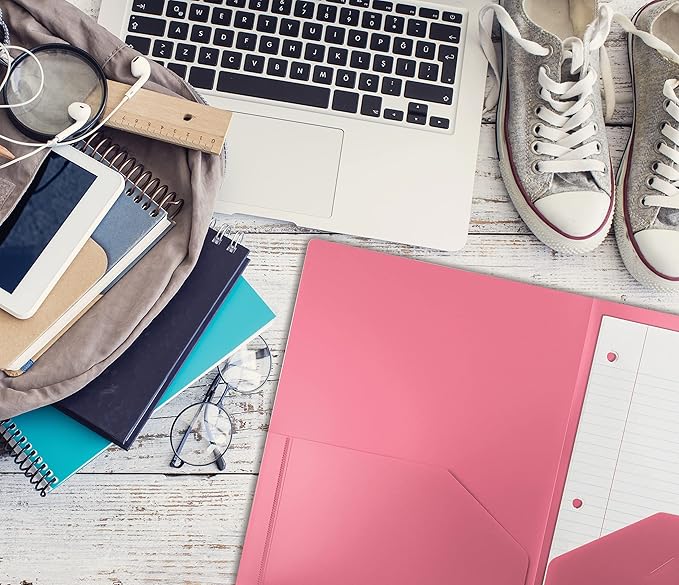 Better Office Products Heavyweight Plastic 2 Pocket Portfolio Folder, Letter Size Poly Folders, 24 Pack (Pink)