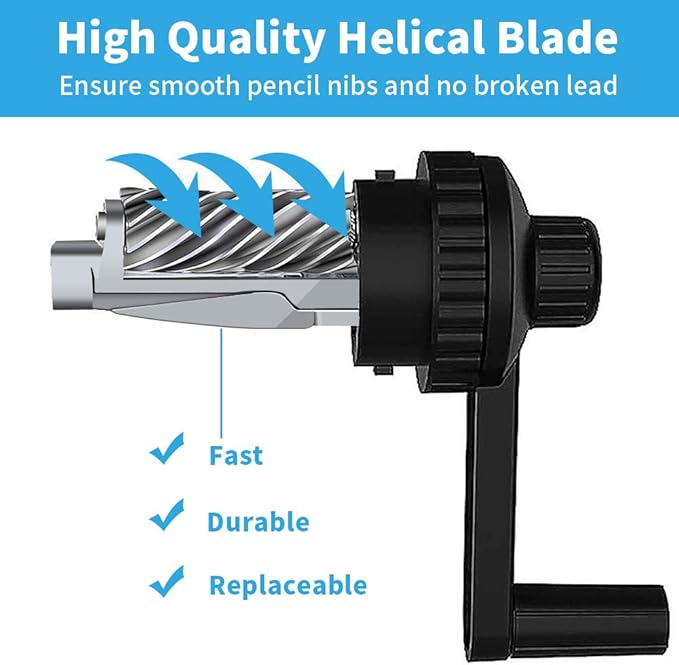 - Professional Art Pencil Sharpener: Still use the old manual pencil sharpener? Look at our helical blade manual pencil sharpener for artists which can sharpen 3000 times. Advantages: Fast, labor saving, lead not easy to break, large capacity shavings box and adjustable pencil nib. Ideal for φ6-8.2mm charcoal/drawing/sketching/colored pencils. (Notes: 1. Not for very soft core pencils and eyebrow pencils. 2. Thicker core will get longer point, standard No.2 pencils don’t have such long points)