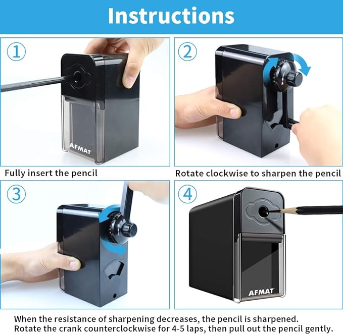 - Self-feed Pencil Sharpener: This artist pencil sharpener is super easy to operate, just insert the pencil into the holder and crank clockwise while holding the sharpener, the pencil starts to move inside the sharpener with each crank; when the resistance decreases crank it anticlockwise and the pencil starts to come out on its own! Do not sharpen any more when the pencil is done, or it will chew up your pencils!