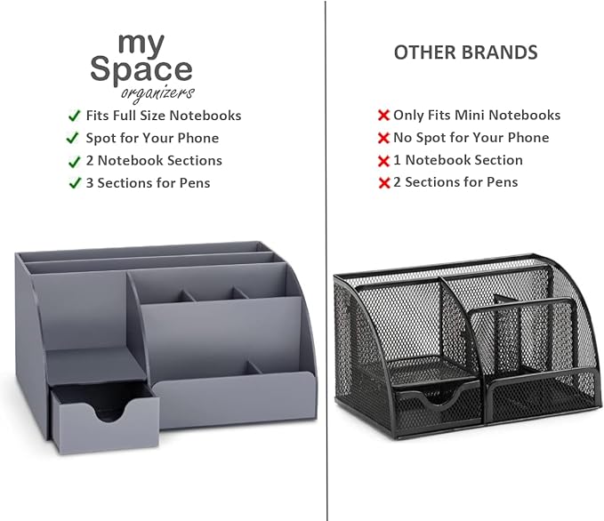 - ALL IN ONE DESK ORGANIZER SET - 9 compartments including drawer. FITS FULL SIZE FOLDERS, notebooks and file folders. Has a SPOT FOR YOUR PHONE. Enough space for all your office desk accessories, papers, scissors, paper clips, sticky notes, pencils, markers, and all your desk supplies. Great office supplies desk organizer. Dimensions are 10”x7.3”x5”.