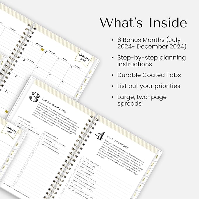 - January 2025 - December 2025 day planner and organizer with weekly/monthly pages and a step-by-step guide for intentional planning; 6 additional monthly pages (July 2024 - December 2024) are included