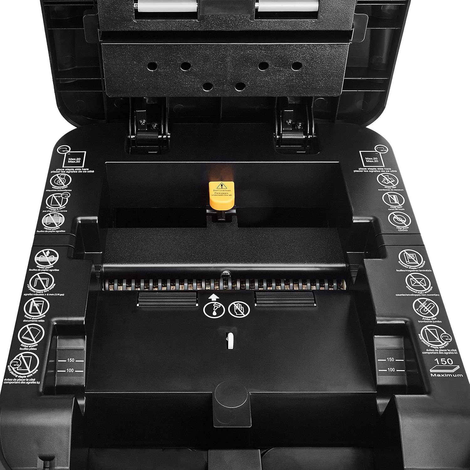 - Shreds up to 150 sheets (auto feed, loaded into 8.5-by-11-inch paper tray) and up to 10 sheets (fed manually) of 20-pound bond paper at a time (no need to remove staples or small paper clips); also destroys credit cards