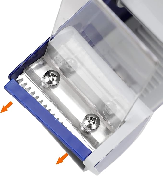 - Metal flap for conveniently threading a new tape roll; blade cover for added safety when not in use