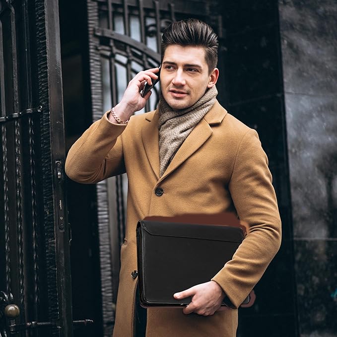 - SLEEK & STUNNING IN HAND – COMPACT FOR TRAVEL – Leather folder looks gorgeous held in hand walking into the board meeting, travel, meeting, office, or interview while sliding neatly into handbags, backpacks while MAINTAINING FAR GREATER STORAGE than traditional leather planners. Easy Organize loose pages, documents, letters, business cards, photos etc.
