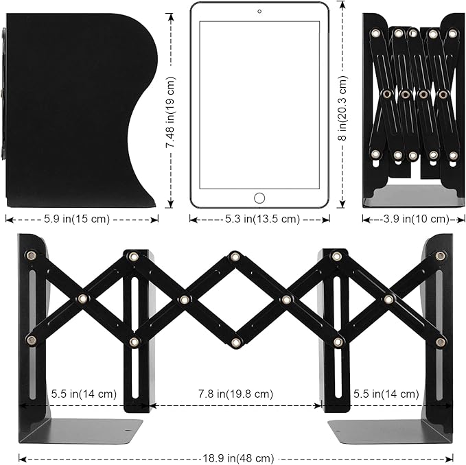 Adjustable Bookends, Metal Book Ends for Heavy Book, 2 Dividers, Nonslip Book Stander for Desk, Shelf, Office, Stationery Gift, Extends up to 19 inches (Black)