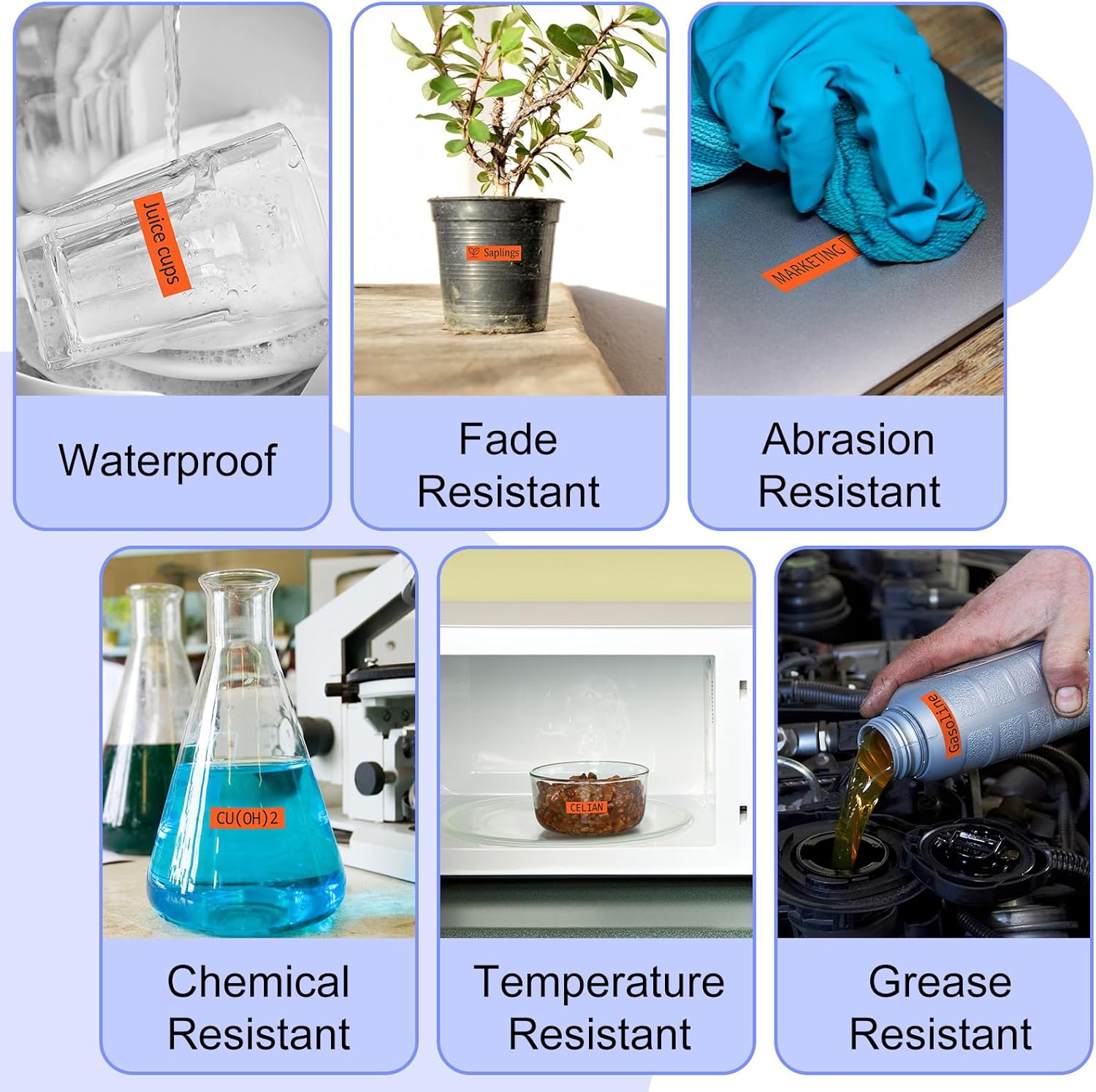 - Upgraded Technology: Thermal printing technology. Designed to stick to almost all clean, dry, flat surface for durability even under harsh conditions. Water-resistant, fading-resistant, abrasion-resistant, chemical-resistant, higher or lower temperature-resistant as well as grease-resistant, exposure to sunlight without fading or peeling