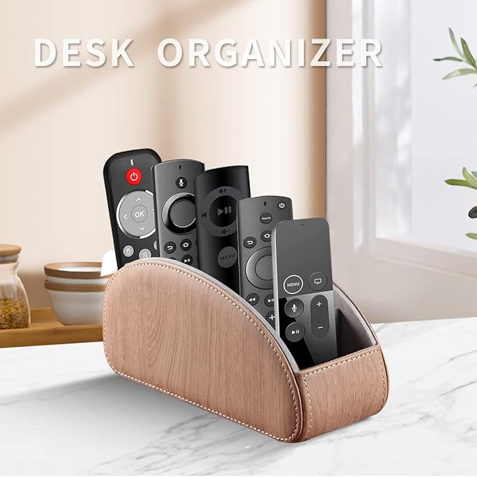 - MULTI-FUNCTIONAL: 5 compartments desk organizer to hold universal remote controllers for air conditioner, cable box, Roku, Apple TV, Amazon Fire TV, soundbars, mobile phone, small electronic media accessories, cosmetic, brush pen and glasses, pens/pencil and other office stationery