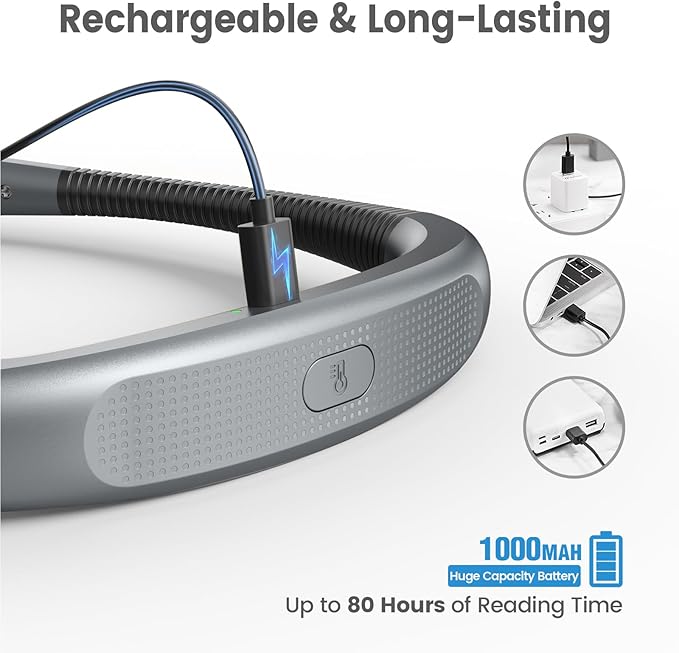 - [Rechargeable & Long-Lasting] This neck reading light rechargeable with USB Type-C which is reversible and therefore easier to plug in compared with other neck lights for crafts charged with Micro-USB. Up to 80 hours (general reading, single head) of powerful, non-diminishing brightness from the included premium rechargeable 1000mAh battery. A long lasting usb rechargeable book light for reading in bed.