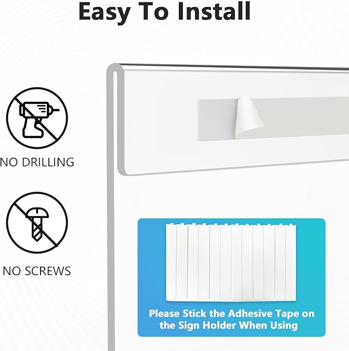 - Easy Installation:The acrylic sign holder 5x7 uses double-sided tape, which can be directly pasted and installed without the need for screws, drilling, and tools, making it more convenient. Almost applicable to any flat surface, such as dry walls, metal, plastic, wood, glass, etc.