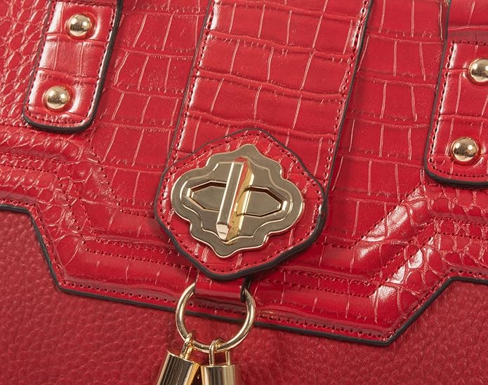 - Red pebble texture faux leather with faux alligator crocodile accent trim. Plus, this red tote bag for women adds a pop of color to any outfit.