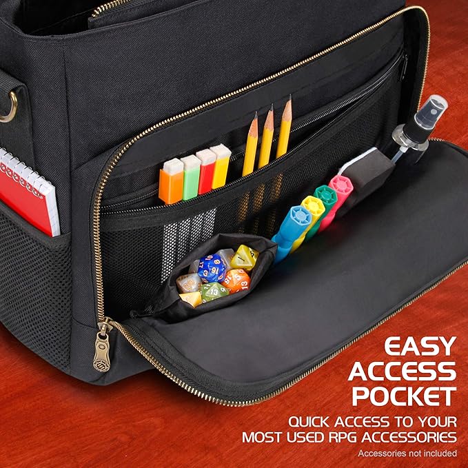 - LARGE LOOT POCKET: Spacious zippered front pocket can store dice, pencils, markers, tokens, small journals and much more to hold your entire game night in one convenient travel bag