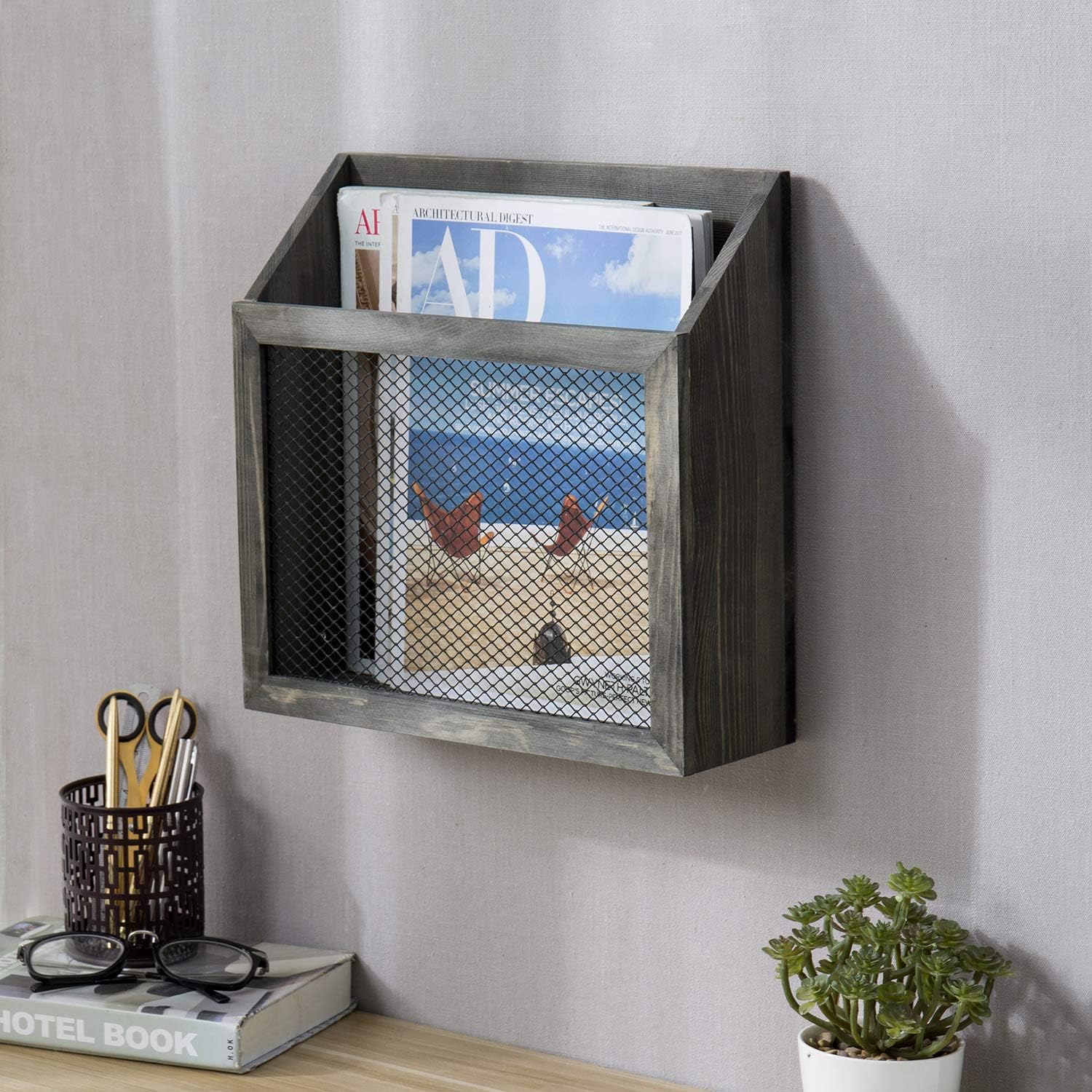 - Wall mounted chicken wire magazine holder rack, perfect for organizing paperwork and reading material in your home or office