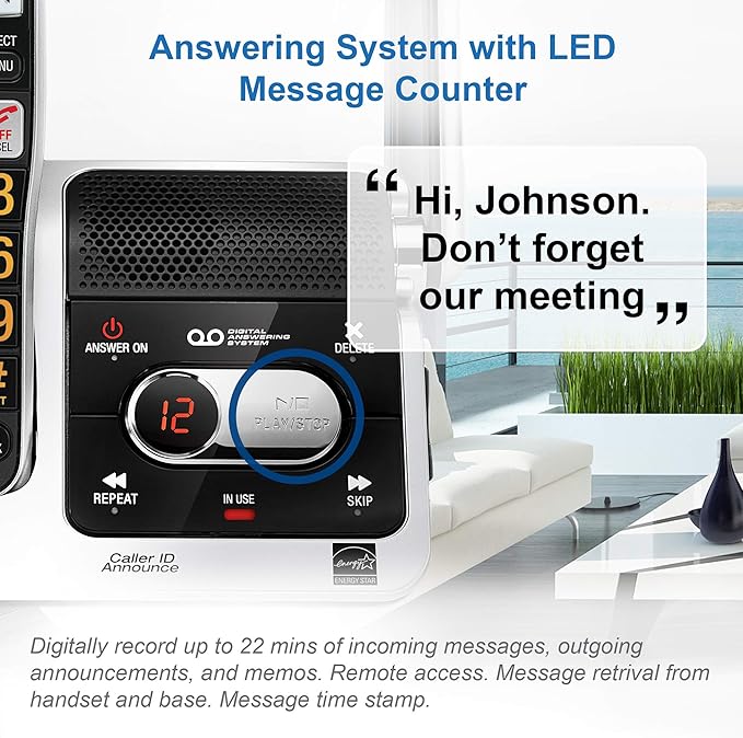 - UNSURPASSED RANGE & ANSWERING SYSTEM Experience the best in long-range coverage and clarity, provided by a unique antenna design and advances in noise-filtering technology. This reliable cordless system includes a digital answering machine that can record up to 22 minutes of incoming messages, outgoing announcements and memos, and a voice-guide for easier set up.