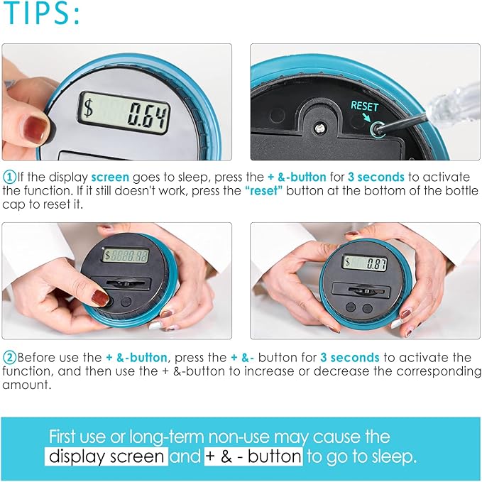- Nice Accuracy & Flexibility: Digital piggy bank can distinguish coins of all sizes with unique identification technology. Displayed amount adjustable with +&- buttons when you unscrew the lid and put the coins directly in the counting coin jar.