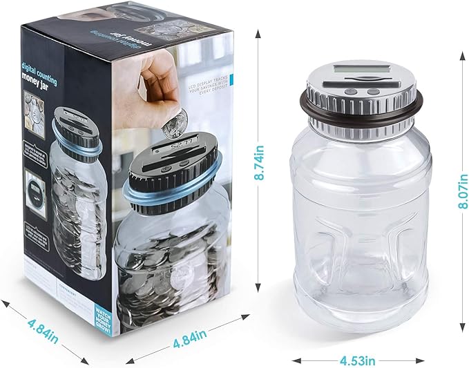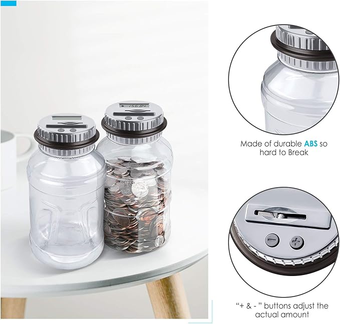 - Know The Amount At Any Time: Coin-counting money jar with legible LCD screen allows you to see the amount of coins quickly and exactly. The digital coin counter is made of ABS plastic. Much more sturdy than glass/ceramic piggy bank.