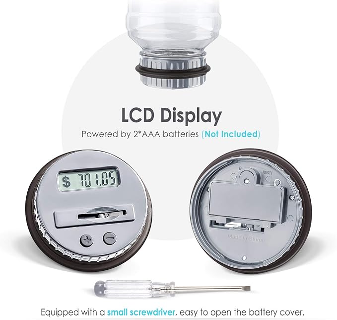 - Designed For All US Coins: Large capacity up to 1.8L, digital counting money jar can storage 800-1000 coins. The digital counting coin bank accepts all US coins and is powered by 2 AAA batteries(Not Included).