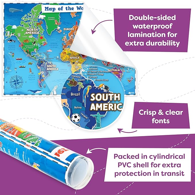 - 24x16 inch sized maps for kids made of extra durable and waterproof plastic sheets. Long-lasting poster to enjoy year on year.