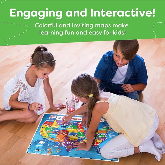 - Comes with 2 waterproof maps, artist-commissioned designs of USA & World map posters for wall. Featuring eye-catching designs that make it easy for kids to stay focused while learning.