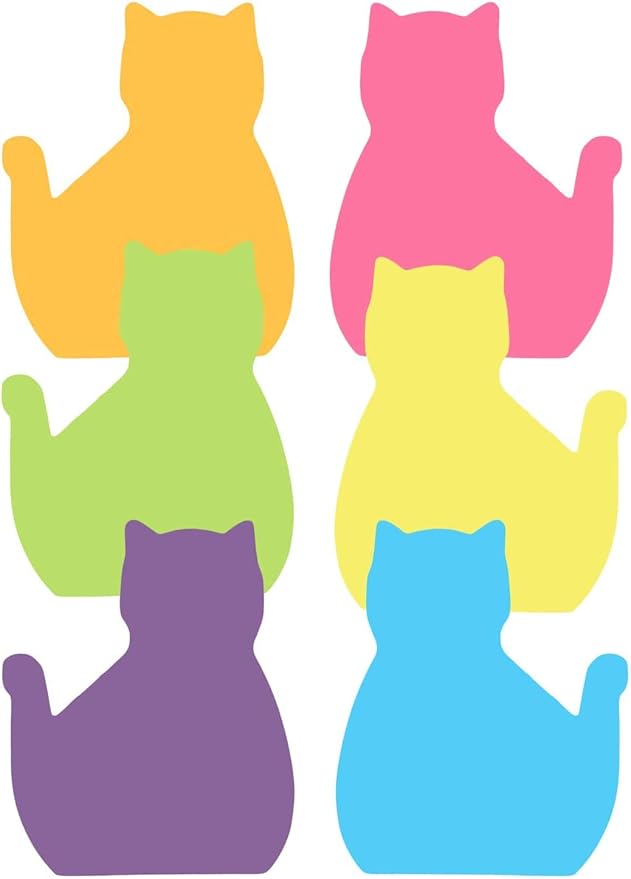 - 6 pack of cat sticky notes. 30 Sheets YELLOW + 30 Sheets PINK BLUE + 30 Sheets GREEN + 30 Sheets PURPLE + 30 Sheets ORANGE