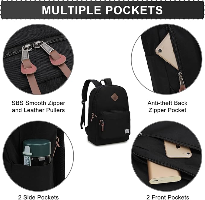 - EASY TO ORGANIZE: Classic backpack features 10 pockets that fits all of the stuffs you need.External access to 2 front zipper pockets,2 side pockets for water bottle ,1 anti theft back zipper pocket for wallet,Internal access to 1 main zipper compartment includes 1 padded laptop compartment fits 15.6 inch laptop ,2 slip pockets and 3 zipper pockets keep all your things organized and easy to access.
