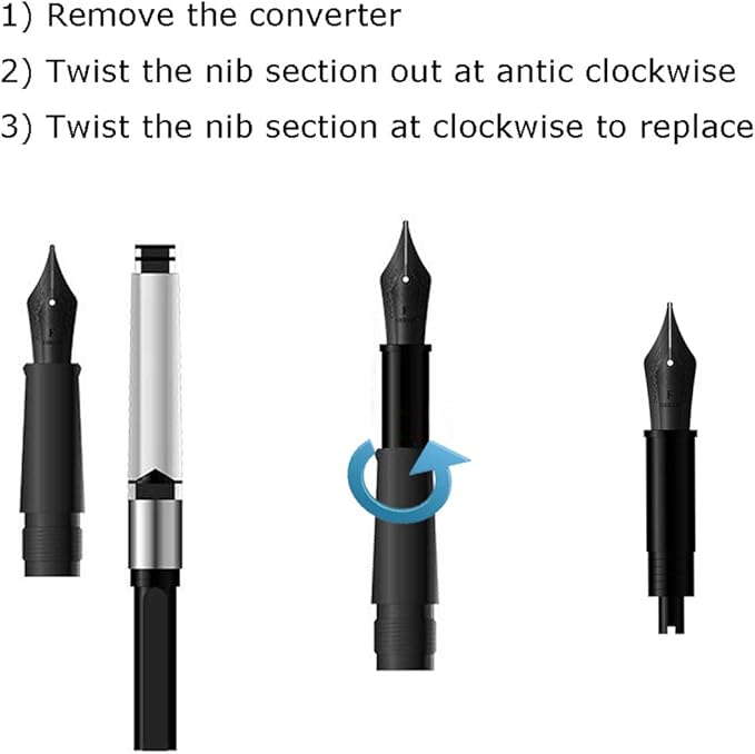 - Easy to replace the nib by twisting it out and back. Please remove the cartridge or converter before twising the nib out.